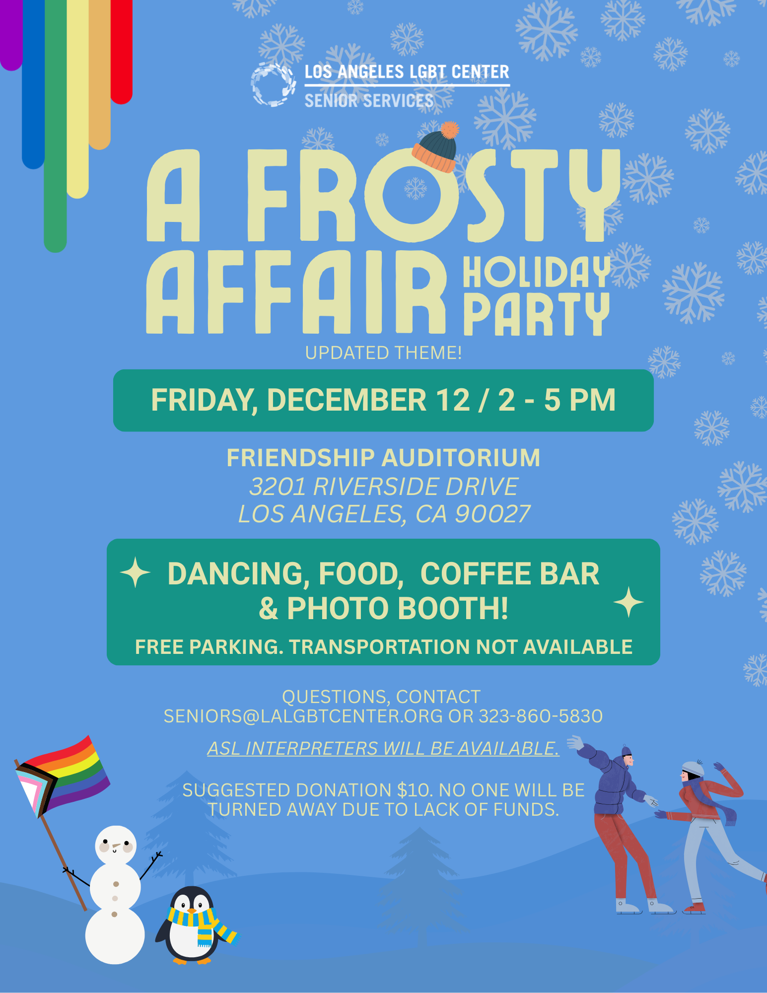 The Center hosts a holiday party for LGBTQ+ older adults every year. Festivities include a sit-down meal, live entertainment, photo booths, and of course, spirited dancing in colorful and festive holiday outfits. This years theme is Winter Olympics.
